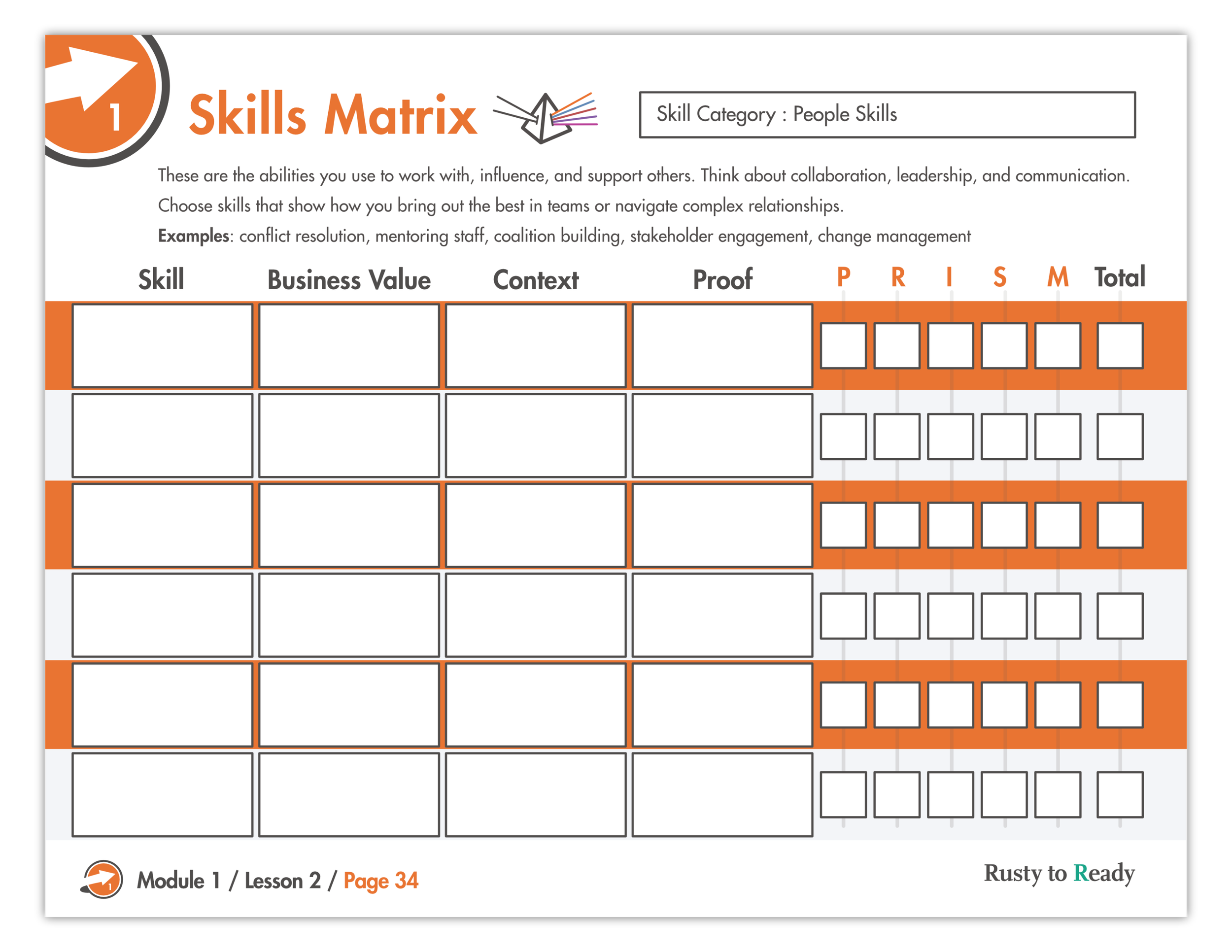 With almost 10 hours of video instruction and over 200 pages of focused, fillable PDF workbook pages, Rusty to Ready is the comprehensive program designed to help you map your story, equip yourself for interviews, and build the confidence to show up strong in every conversation.